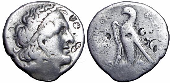 PTOLEMAIC KINGS OF EGYPT. Ptolemy I Soter, 305-282 BC. Tetradrachm (Silver, 26 mm, 13.82 g, 12 h), signed by D..., Alexandria, c. 300-285. Diademed head of Ptolemy I to right, wearing aegis around his neck; within his hair behind his ear, tiny letter Δ. Rev. ΒΑΣΙΛΕΩΣ ΠΟΛΕΜΑΙΟΥ Eagle, with closed wings, standing left on thunderbolt; to left, Ρ above monogram of ΠΑΡ. Noeske 41-42. SNG Copenhagen 70-71. Svoronos 255. Clear and attractive, with a powerful portrait of Ptolemy. Small countermarks ( Letter D and star on Obv, on the obverse and a graffito of H on the reverse, otherwise, Choice VF. |