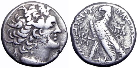 PTOLEMAIC EGYPT. Ptolemy XII Auletes (80-51 BC). AR tetradrachm (24mm, 12.54 gm, 12h). Alexandria, dated Regnal Year 23 (59/8 BC). Diademed head of Ptolemy I right, aegis tied around neck; dotted border / ΠΤΟΛΕΜΑΙΟΥ-ΒΑΣΙΛΕΩΣ, eagle with closed wings standing left on thunderbolt; L KΓ (date) in left field, ΠΑ in right field, dotted border. Svoronos 1684 (Ptolemy X Soter II, 94/3 BC). SNG Copenhagen 372 (same). VF. The coin is Ptolemy X issue since Ptolemy XII issues have the eagle with palm over right wing and an Isis headdress in left field. |