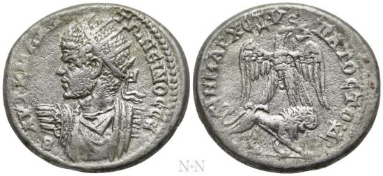 ★ Bold Portrait ★ Obv: AVT K M A ANTΩNЄINOC CЄB. Radiate, draped and cuirassed bust with head left and body seen from front. Rev: ΔHMAPX ЄΞ VΠATOC TO Δ. Eagle standing facing, head and tail right, with wings spread, holding wreath in beak, on top of lion advancing right. Prieur 941. Rare Condition: Very fine. Weight: 13.23 g. Diameter: 28 mm. |