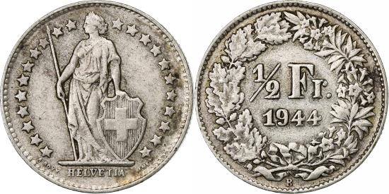 | | Switzerland, 1/2 Franc, 1944, Bern, Silver, , KM:23 | | | Standing Helvetia with lance and shield within star border, Value, date within wreath | | FEATURES |