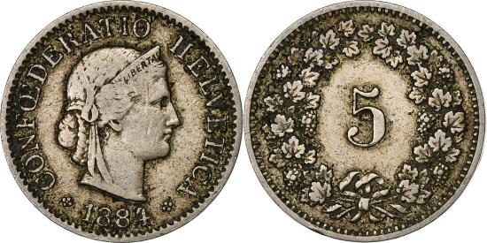 | | Switzerland, 5 Rappen, 1884, Bern, Copper-nickel, , KM:26 | | | Crowned head right, Value within wreath, CONFOEDERATIO HELVETICA Karl Schwenzer | | FEATURES |
