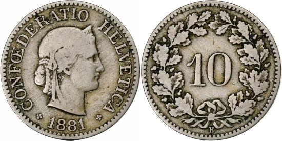 | | Switzerland, 10 Rappen, 1881, Bern, Copper-nickel, , KM:27 | | | Crowned head right, Value within wreath, CONFOEDERATIO HELVETICA Karl Schwenzer | | FEATURES |