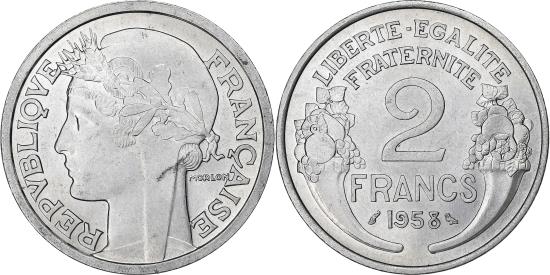 | | France, 2 Francs, Morlon, 1958, Paris, Chouette, Aluminum, | | | Morlon, Laureate head left, Denomination and date flanked by cornucopias | | FEATURES |