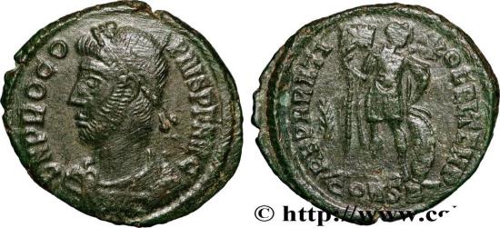 PROCOPIUS Maiorina ou nummus 365-366 Constantinople R2 copper Obverse : D N PROCO-PIVS P F AVG Buste diadémé, drapé et cuirassé de Procope à gauche, vu de trois quarts en avant (A1a) ; diadème perlé Reverse : REPARATI-O FEL TEMP/ -|-// CONSE. Procope, vêtu militairement debout de face tourné à gauche tournant la tête à droite, tenant l’étendard de la main droite et sappuyant sur un bouclier de la main gauche ; dans le champ en haut à droite, un chrisme ; dans le champ à gauche,une palme Commentary : Monnaie centrée. Joli buste. Revers à l’usure régulière. Patine vert foncé