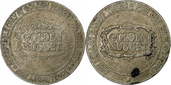 | | United States, Gaming Token, Golden Nugget, 1 Dollar, , Copper-nickel | | | This 1 dollar gaming token is only valid at the Golden Nugget in Atlantic City. It has black marks on the edge and reverse. | | FEATURES |
