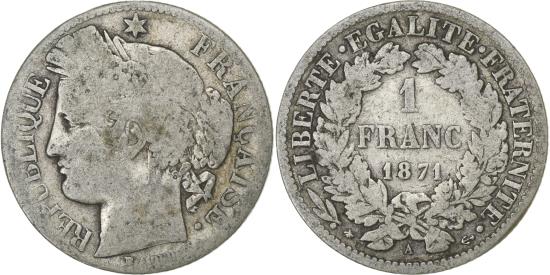 | | France, Franc, Cérès, 1871, Paris, Silver, , Gadoury:465a, KM:822.1 | | | Cérès, Laureate head left, Denomination within wreath | | FEATURES |