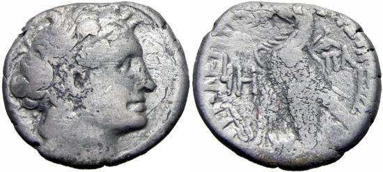 PTOLEMAIC KINGS of EGYPT. Cleopatra VII. 51-30 BC. AR Tetradrachm (25mm, 13.65 gm). Alexandria mint. Dated year 18 (35/34 BC). Diademed head right, wearing aegis / Eagle standing left on thunderbolt, palm over shoulder; L IH (date) before; PA behind. Svoronos 1832; SNG Copenhagen 414. Near VF.