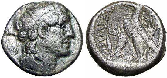 PTOLEMAIC KINGS of EGYPT. Kleopatra VII Thea Neotera. 51-30 BC. AR Tetradrachm (23mm, 13.17 g, 11h). Alexandreia mint. Dated RY 14 (39/8 BC). Diademed head of Ptolemy I(?) right, wearing aegis / Eagle with closed wings standing left on thunderbolt, palm frond over shoulder; to left, LIΔ (date) above headdress of Isis; ΠΑ to right. Svoronos 1828; SNG Copenhagen 408; DCA 70. Faintly toned, tiny flan flaws, some weakness to strike. Near VF. |