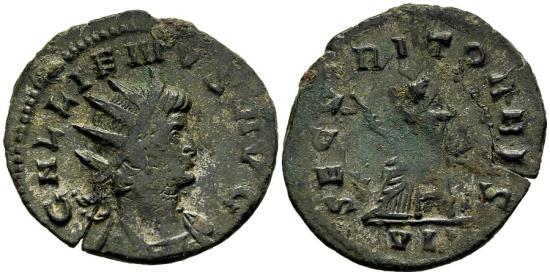 Gallienus, August 253 - September 268 A.D. RA115543. Billon antoninianus, Göbl MIR 555n, RSC IV 954, Hunter IV S47, RIC V-1 S278, SRCV III 10357, gF, broad flan, dark green patina, weak centers, scratches, edge crack, 2.528g, 21.3mm, 30o, 6th officina, Rome mint, GALLIENVS AVG, radiate and cuirassed bust right, seen from the front; reverse SECVRIT ORBIS (Latin: the world is safe), Securitas seated left, short scepter in right hand, propping head on left hand, left arm resting on back of chair, VI in exergue; ex Leu Numismatik auction 29 (24-26 Feb 2024), lot 3768 (part of) The reverse legend and Securitas' relaxed pose were more propaganda than an indicator of the actual security of the empire. Gallienus faced many usurpers and barbarian incursions his reign. |