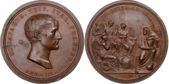 | | France, Medal, Napoléon Bonaparte, Échec des attentats à la vie de Bonaparte | | | Head of Napoleon Bonaparte, right., Representation of the Moires/Parques, winged, weaving the thread of Bonaparte's Destiny, and on the right a representation of Destiny seated, looking at them, with an urn in his hands and his foot set on a globe., BONAPARTE. REIP. ITAL. PRAESES. / ANNO. III., DVX. TVTVS. AB. INSIDIIS. | | FEATURES |
