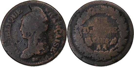 | | France, Decime, Dupré, AN 8, Metz, Copper, , Gadoury:187a | | | The denomination and date on the reverse have been erased by numerous vertical lines. | | FEATURES |