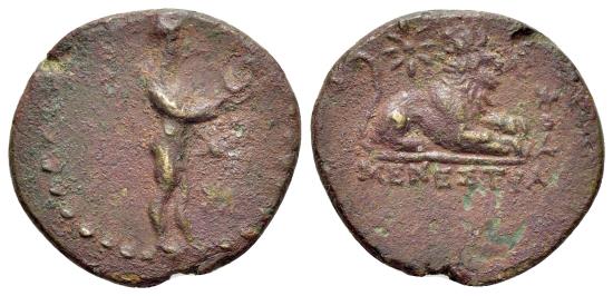| Ionia, Miletos, c. 200 BC. Æ. ΜΕΝΕΣΤΡΑΤΟΣ (Menestratos), magistrate. Apollo Didymeus. R/ MENEΣTPATOΣ, lion seated. Star above, monogram to right. |