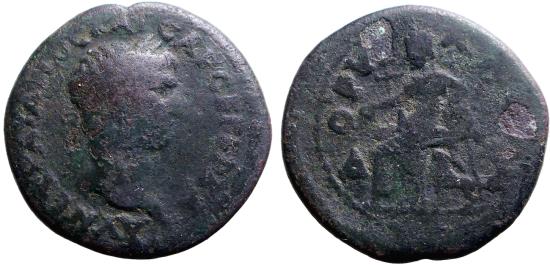 Trajan AE25 Assarion. Phrygia, Dorylaeum. Cybele seated w. lion Obv: Laureate head of Trajan to right. ΑΥ ΝΕ ΤΡΑΙΑΝΟϹ ΚΑΙϹΑΡ ϹΕ ΓΕΡ ΔΑ. Rev. Cybele seated left, holding patera in her extended right hand, resting on tympanum with her left arm; beside, lion left. ΔΟΡΥΛ ΑΕΩΝ. RPC III 2637. 98-117 AD. 10.08g. |