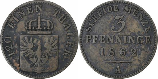 | Kingdom of Prussia, Wilhelm I, 3 Pfennig, 1862, Berlin, Copper, |