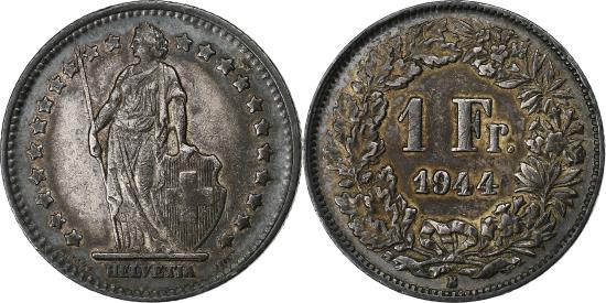 | | Switzerland, Franc, 1944, Bern, Silver, , KM:24 | | | Standing Helvetia with lance and shield within star border, Value, date within wreath | | FEATURES |
