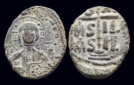 Anonymous, attributed to Romanus III (1028-1034AD) AE follis- 11,61 gram- 30 mm, Constantinople mint Obv: +ЄMMA-NOVH. Nimbate bust of Christ Pantokrator facing, wearing tunic and himation, raising right hand in benediction and holding book of Gospels in His left, square in two limbs of the nimbate cross, square and four dots in top limb of the nimbate cross, IC XC in fields Rev: Large cross pommée set upon three steps; IS XS above crossbar; BASILЄ/ BASILЄ in two lines below SB 1823 |