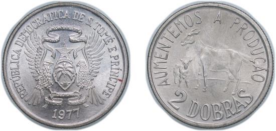 São Tomé and Príncipe Democratic Republic 1977 2 Dobras (FAO: Animal Husbandary) Copper-nickel Staatliche Münze Baden-Württemberg Mint (1000000) 2.48g UNC KM 27 Schön 30