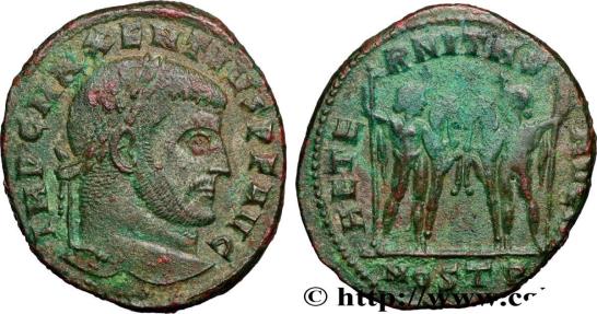 MAXENTIUS Augustus Follis ou nummus 309 Ostie R2 copper Obverse : IMP C MAXENTIVS P F AVG Tête laurée de Maxence à droite (O*) Reverse : AETERNITAS AVG N/ -|-// MOSTP Castor et Pollux (les Gémeaux ou les Dioscures), surmontés dune étoile, nus debout face à face, le manteau sur lépaule gauche, tenant chacun un sceptre long et, de la main gauche, la bride de leurs chevaux Commentary : Monnaie centrée. Des faiblesses au revers. Joli portrait de Maxence. Patine marron-vert