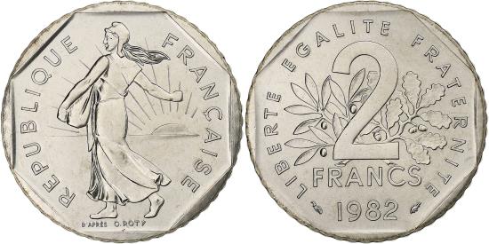 | | Coin, France, Semeuse, 2 Francs, 1982, Paris, série FDC, , Nickel | | | Semeuse, The Seed Sower, Denomination on branches, date below | | FEATURES |