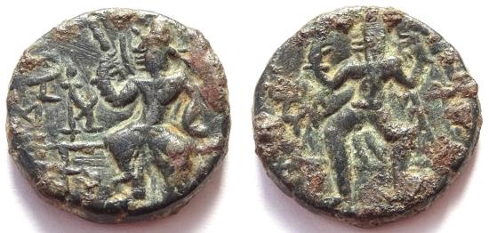 Obverse: King seated on throne, head left, with one hand raised; Bactrian legend around