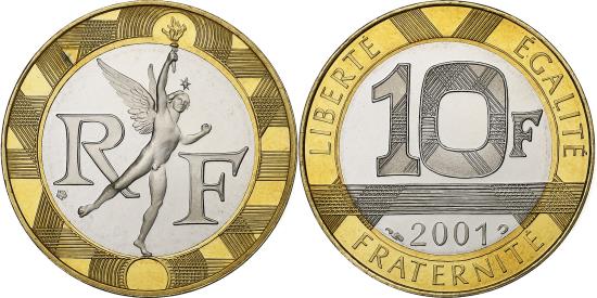 | | Coin, France, Génie, 10 Francs, 2001, Paris, BE, , Aluminum-Bronze | | | Génie, Winged figure divides RF, Patterned denomination above date | | FEATURES |