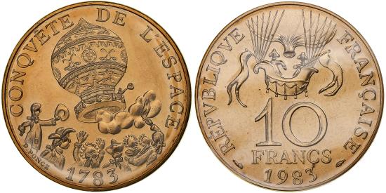 | | Coin, France, La conquête, 10 Francs, 1983, Paris, série FDC, Tranche B | | | La conquête, Denomination and date below balloon basket, Balloon, figures and date below | | FEATURES |