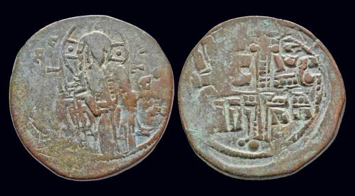 Anonymous, attributed to Michael IV (ca 1034-1041AD) AE follis- 9,29 gram- 31 mm, Constantinople mint obv: +EMMANOVHΛ IC - XC, three-quarter length figure of Christ Antiphonetes standing facing, wearing halo with cross, raising right hand in benediction and holding book of Gospels in left rev: jeweled cross, with pellet at each extremity; in the angles, IC - XC / NI - KA SB1825 |