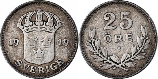 | | Sweden, Gustaf V, 25 Öre, 1919, Silver, , KM:785 | | | Small crowns within crowned shield divides date, Value above sprigs | | FEATURES |
