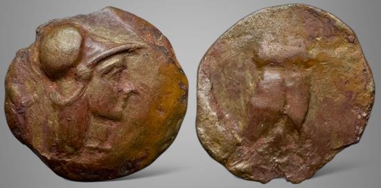 Rev.: Anepigraphic. Owl standing right, head facing, three feathers
