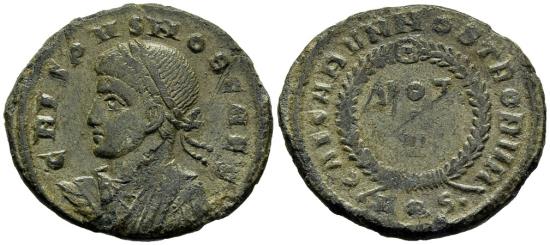 Crispus, Caesar, 1 March 317 - 326 A.D. RL115552. Billon centenionalis, RIC VII Aquileia 88 (R2), SRCV IV 16749, Cohen VII 33, Hunter V -, VF, centered, green patina, scratches, 2.701g, 19.7mm, 180o, 2nd officina, Aquileia mint, CRISPVS NOB CAES, laureate, draped, and cuirassed bust left; reverse CAESARVM NOSTRORVM (Latin: our prince), VOT V in wreath, •AQS• in exergue; ex Leu Numismatik auction 29 (24-26 Feb 2024), lot 3768 (part of) VOT V abbreviates Votis Quinquennalibus, advertising that Julian had completed his vows (prayers) to thank the gods his upcoming fifth anniversary as caesar. |