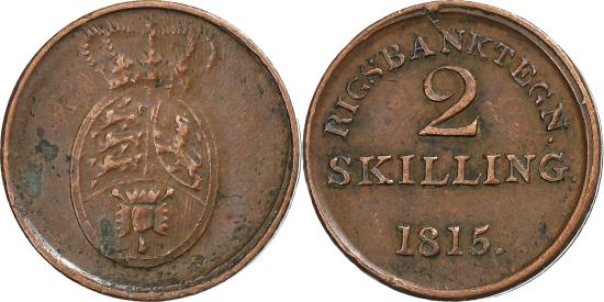 | | Denmark, 2 Skilling, 1815, Copper, , KM:Tn4 | | | Crowned arms of Denmark, Norway and Holstein, Value and date | | FEATURES |