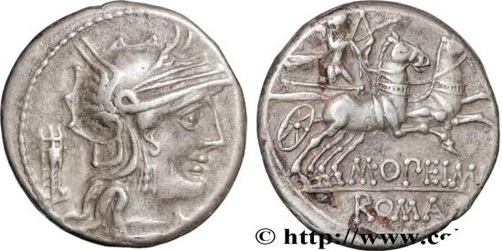 OPIMIA Denier 131 AC. Rome R1 silver Obverse : Anépigraphe Tête casquée de Rome à droite, coiffée du casque ailé ; derrière la tête, un trépied ; sous le menton, marque de valeur (XVI) en monogramme Reverse : ROMA à lexergue ; M. OPEIMI en monogramme au-dessus du cartouche Apollon dans un bige galopant à droite, tenant un arc bandé avec une flèche de la main droite et les rênes de la gauche Commentary : Monnaie idéalement centrée. Joli revers, bien venu à la frappe. Portrait agréable. Patine grise
