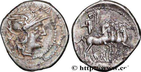 ROMA à lexergue Hercule, nu debout dans un quadrige au pas à droite, tenant la massue de la main droite, les rênes et un trophée de la main gauche