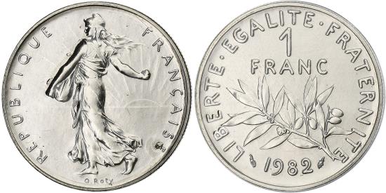| | France, Franc, Semeuse, 1982, Paris, série FDC, Nickel, , Gadoury:474 | | | Semeuse, The Seed Sower, Laurel branch divides denomination and date, Without mint mark., Louis Oscar Roty | | FEATURES |