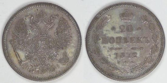 RUSSIA - Empire, Alexander II, 1872 СПБ HI, 20 Kopeks, Choice Extra Fine