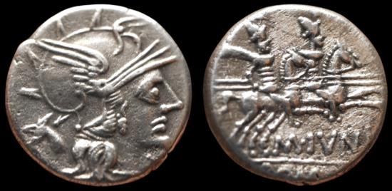 | Junius. M. Junius Silanus. AR Denarius. 145 BC. Rome. Ovv.: Head of Roma right, X below chin, ass's head behind. Rev.: The Dioscuri right, stars above, M.IVNI., below horses, ROMA in exergue