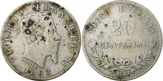 | | Italy, Vittorio Emanuele II, 20 Centesimi, 1863, Milan, Silver, | | | Head right, Value above sprays, VITTORIO... | | FEATURES |