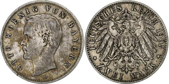 | | German States, BAVARIA, Otto, 2 Mark, 1905, Munich, Silver, , KM:913 | | | Head left, Crowned imperial German eagle, Open and closed curl varieties exist. Prev. KM#511. Varieites exist, OTTO KOENIG VON BAYERN / D, DEUTSCHES REICH 1905 // * ZWEI MARK *. | | FEATURES |