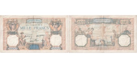| | France, 1000 Francs, Cérès et Mercure, 1939-09-21, C.7861539, AU(55-58) | | | Signature H. de Bletterie, P. Rousseau and R. Favre-Gilly. 24.3.1938-18.7.1940., Ceres at left, Mercury at right, two small angels below. Signature title: LE CAISSIER GÉNÉRAL., Four different craftsmen., Ochre, blue and multicolor. | | FEATURES |