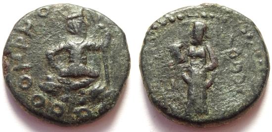 Kushan empire Huvishka (ruled c. 150-191 AD) AE tetradrachm (15.3 g) Obverse: Nimbate king seated cross-legged, head to right with one hand raised; Bactrian legend around Reverse: Ardoksho standing left, holding cornucopia; tamgha to left; Bactrian legend APDOX to right Ref: Unpublished A new discovery in Kushan copper coinage! This type is unrecorded in Gobl. The obverse is similar to Gobl 920 and the reverse is similar to Gobl 877, but this type is not known till now. No specimens are listed on CoinArchives. RRRR and possibly unique. |