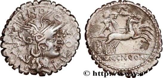 POMPONIA Denier serratus 118 AC. Narbonne R1 silver Obverse : L. POM-P-ONI. C (NF) Tête casquée de Rome à droite ; derrière la tête, marque de valeur, (X) Reverse : L. LIC. CN. DOM à lexergue Bige galopant à droite, conduit par Bituit, brandissant une lance de la main droite, et tenant un bouclier, le carnyx et les rênes de la main gauche Commentary : Monnaie centrée. Joli revers. Usure régulière. Patine grise