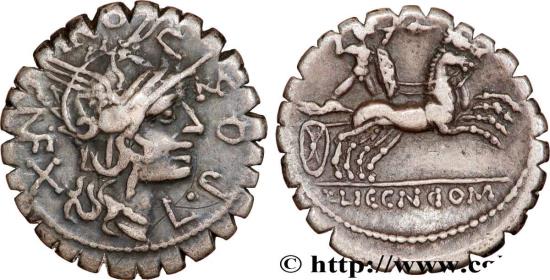 POMPONIA Denier serratus 118 AC. Narbonne R1 silver Obverse : L. POM-P-ONI. C (NF) Tête casquée de Rome à droite ; derrière la tête, marque de valeur, (X) Reverse : L. LIC. CN. DOM à lexergue Bige galopant à droite, conduit par Bituit, brandissant une lance de la main droite, et tenant un bouclier, le carnyx et les rênes de la main gauche Commentary : Monnaie légèrement décentrée. Très beau portrait de Rome. Revers à l’usure régulière. Patine grise