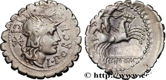 PORCIA Denier serratus 118 AC. Narbonne R2 silver Obverse : L. PORCI - LICI Tête casquée de Rome à droite ; derrière la tête, marque de valeur, (XVI) Reverse : L. LIC. CN. DOM à lexergue Bige galopant à droite, conduit par Bituit, brandissant une lance de la main droite, et tenant un bouclier, le carnyx et les rênes de la main gauche Commentary : Flan large, légèrement décentré au revers. Joli portrait de Rome. Patine grise