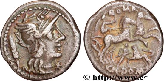 DOMITIA Denier 128 AC. Rome R1 silver Obverse : Anépigraphe Tête casquée de Rome à droite ; derrière la tête, un épi ; sous le menton, (XVI) en monogramme Reverse : ROMA au-dessus ; CN. DOM à l’exergue Victoire dans un bige galopant à droite, tenant une couronne de la main droite et les rênes de la main gauche ; au-dessous, un chasseur debout à droite, brandissant une javeline face à un chien sauvage l’attaquant Commentary : Flan large, centré. Joli portrait de Rome. Revers à l’usure régulière. Patine grise avec de légers reflets dorés