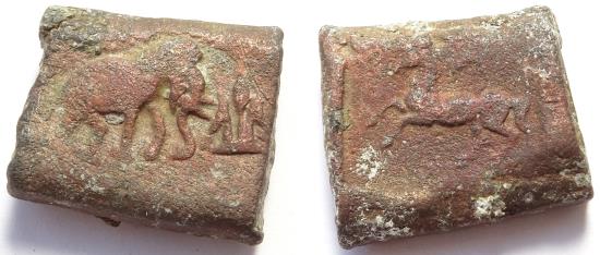 Taxila city state (Pushkalavati) c. 185-165 BC AE karshapana (c. 11.81 g) Obverse: Elephant advancing right, with lotus standard to right Reverse: Horse galloping left Ref: HGC 12, 774; MACW 4404-4407 This horse type is more rare than the lion type. Our specimen has complete details. Rare and CHOICE. |
