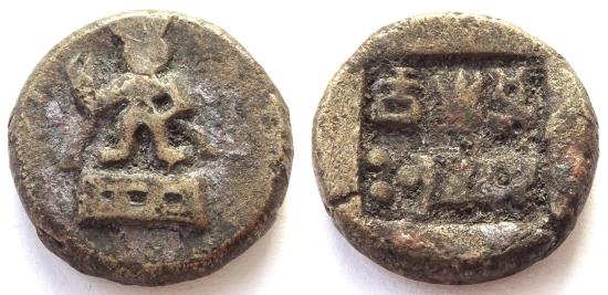 Panchala kingdom at Ahichchhatra Indramitra, c. 75-50 BC AE 1/2 karshapana (5.86 g) Obverse: King of the Gods, Indra, standing on platform, holding a thunderbolt Reverse: Brahmi legend Indamitasa, with three dynastic symbols above Ref: MACW 4539 The Pancala kingdom rose in northern India amid the collapse of the Mauryan empire. These are among the first indigenous coins of India to be inscribed with the ruler's name. The Hindu deity/symbol depicted on the obverse usually has a connection with the king's name on reverse. Here the deity is Indra holding a thunderbolt, symbolizing the king's name Indra. A CHOICE specimen boldly struck. |