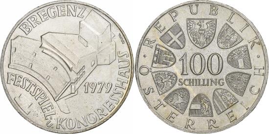 | | Austria, 100 Schilling, 1979, Silver, , KM:2945 | | | Value within circle of shields, Festival and Congress Hall at Bregenz, date lower right | | FEATURES |