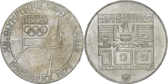 | | Austria, 100 Schilling, 1976, Hall, Silver, , KM:2929 | | | Box surrounds stylized Imperial Eagle, Austrian shield on breast, above value, small shield below box, Ski jump, Olympic logo upper left, circle surrounds, date lower right | | FEATURES |