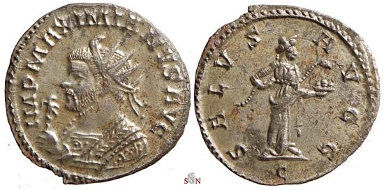 Maximianus I. Antoninianus, struck AD 290-294 at Lugdunum mint. Obv: IMP MAXIMIANVS AVG, radiate bust left, wearing imperial robes, holding eagle-tipped sceptre. Rev: SALVS AVGG / C, Salus