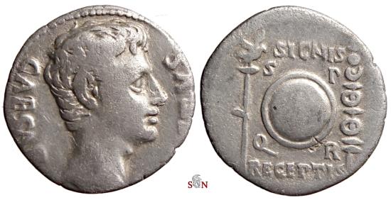 Augustus Denarius, struck 19 BC at Spanish mint (Colonia Patricia?). Obv: CAESAR AVGVSTVS, bare head to right. Rev: Round shield inscribed CL•V,